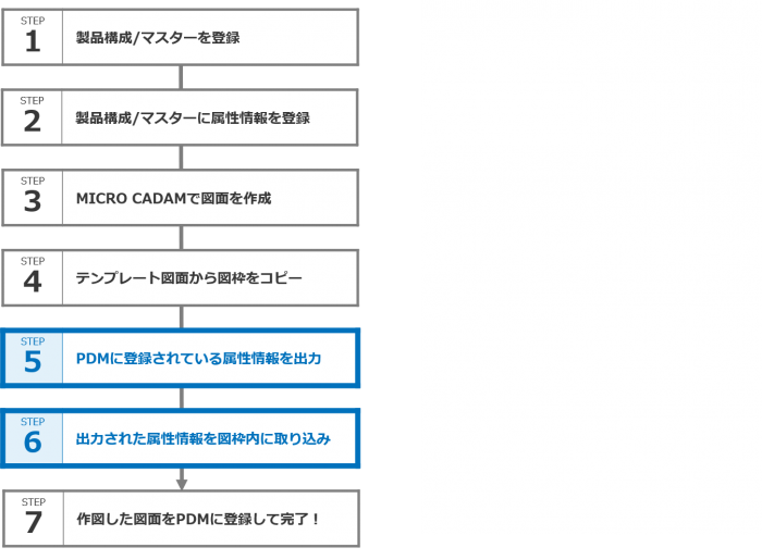 そうですね。図面作成までの流れとしては、まずPDMで製品構成/マスターを登録し、次にPDMで必要な属性情報を登録した後、図面やモデルを作成…となります。