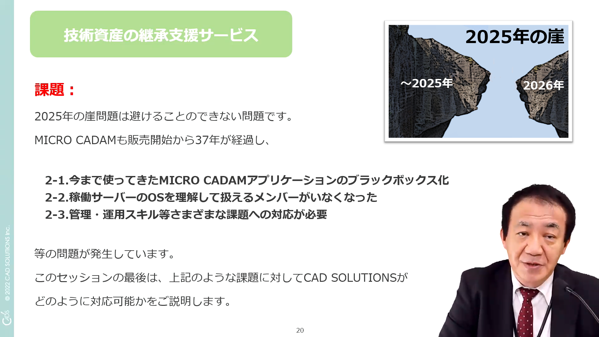 近年、設計環境の変化がトリガーとなり、MICRO CADAM Helix をご利用いただいているお客様のニーズも多様化しています。弊社ではお客様の課題をお伺いし、個別ソリューション開発や支援を行っています。CAD単体ではなく、「CAD+α(個別ソリューション)」で、利用効果は大きく拡大できます。当セッションでは、ここ数年間にお客様に個別提供したさまざまなMICRO CADAM Helix関連ソリューション事例をご紹介いたしました。開催後のアンケートには「そういった活動を知ることができて安心した」「困りごとが生じたら相談してみたい」等のお声をいただきました。ぜひ、些細な事でもわれわれ CAD SOLUTIONSにご相談いただければと思います。